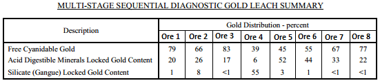 The diagnostic leach results indicate that, on average, about 64 percent of the gold content occurred as free cyanidable gold. Lithology composite ore 4 and 5 were less than 50%. The remaining gold was associated with acid digestible minerals, such as iron sulphides and iron oxides, being, on average, about 27%. Lithology composite on Ore 4 had a significant proportion of the gold content locked in gangue minerals, being about 55% of the gold in the feed.