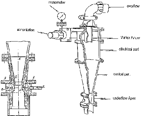 The problem now is to control the efficiency of the hydrocyclone. To do this you control the density of the cyclone. Because the cyclone works upon the pressure inside of it, adding or taking away water that is being fed to it will control the grind of the ore being discharged. As pressure increases inside the cyclone, the SPEED of the spiral increases, this increases the centrifugal force as well as the discharge rate of the cyclones underflow. The extra water in effect displaces the ore at the centre of the vortex. This causes more of the ore to be pushed closer to the side wall of the cyclone. This will take it past the point that the apex finder will dissect the flow of slurry.