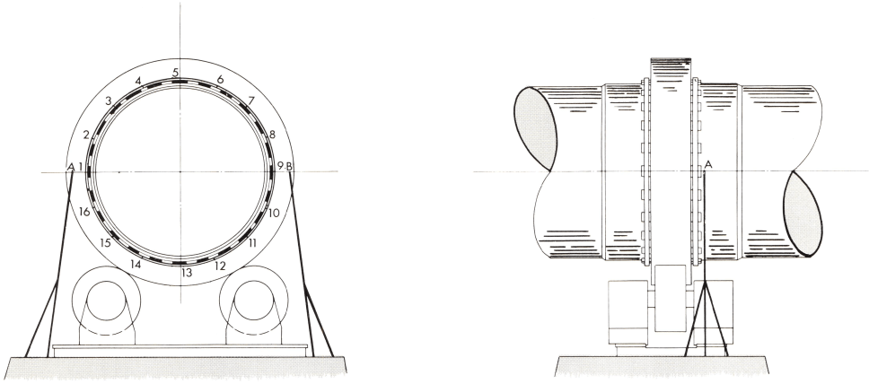 Check the setting of the kiln shell in relation to the true centerline of the bases. This can be done by stringing a cord with a plumb bob attached to each end over the top of the shell as near the riding rings as possible. In cases where there are irregularities in the shell, the cord should be strung over the wearing faces of the riding rings. This cord must be long enough to permit the plumb bobs to hang free beneath the kiln, as shown in Figure 1. The midpoint of the distance between these plumb bobs is the center of the kiln shell at that position. Mark this point on the bases and proceed with the same operation at the next support. Rotate the shell 90 degrees and repeat the markings at each support. The mean of the four marks at each quarter point through a complete revolution will then indicate the path from support to support of the true centerline of the kiln shell.