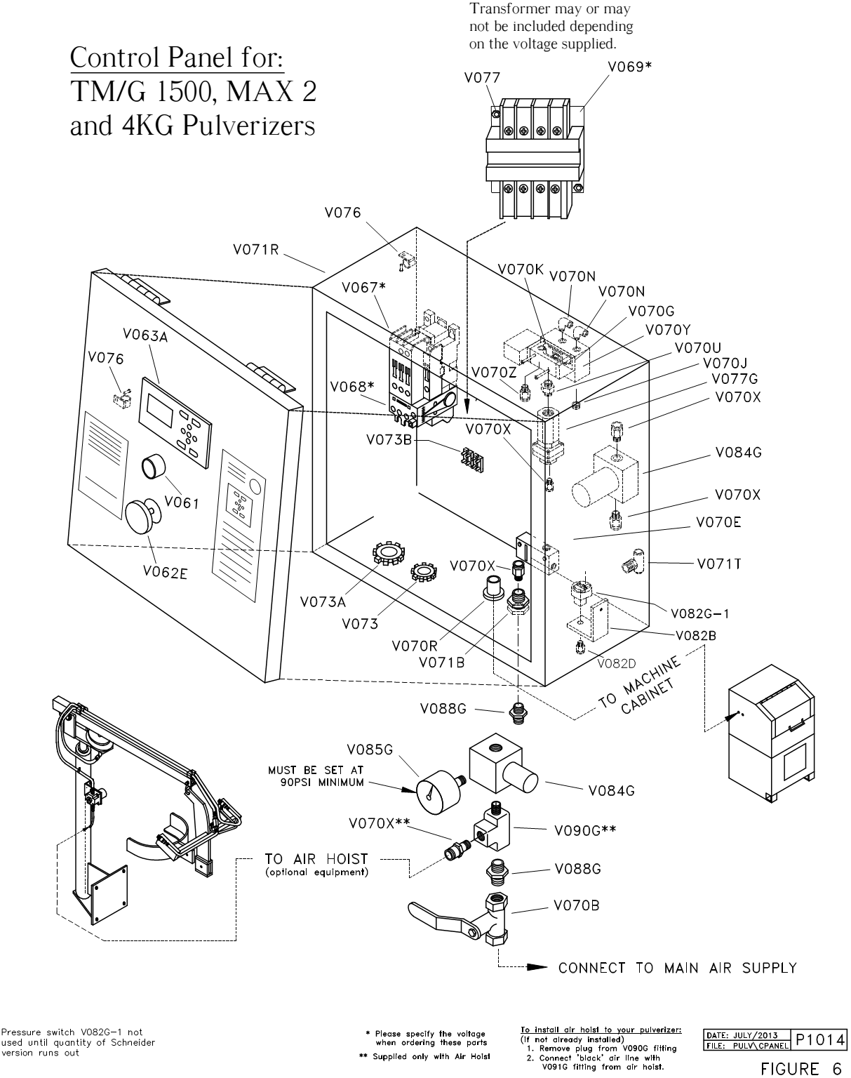 Also in the control panel there is a vacuum valve (V070E), which controls the airbag retraction. See Figure 5. With the air supply on, an airflow of 7-8 psi can be heard from the valve exiting it when the machine is not operating. At this pressure, the airbag will fully retract in 4-6 seconds. If the machine is not being used for a long period of time, turn the main airline supply off (V070B-Ball Valve).