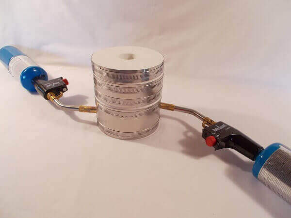 The 6″ is hand built out of the same Alumina Silicate refractory sheet material used in all products and is neatly wrapped in stainless steel. As a kit, the 6″ comes to you almost complete. You’ll need to purchase a couple of small propane bottles that are readily available in any sporting goods, camping or plumbing supply store, and two Bernzomatic TS400 torches or other brands rated at 6,000 BTU each. These are easily bought in most plumbing departments, or online.